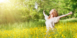 beautiful girl enjoying the summer sun Eine Frau genießt die Sonne mit offenen Armen in einer Blumenwiese