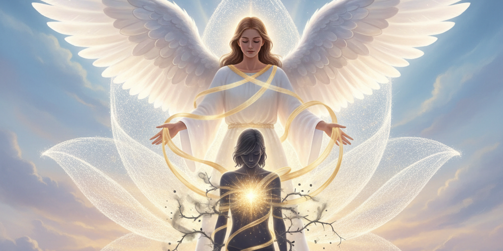 Ein engel hinter einer Frau der ihre verstrickungen löst